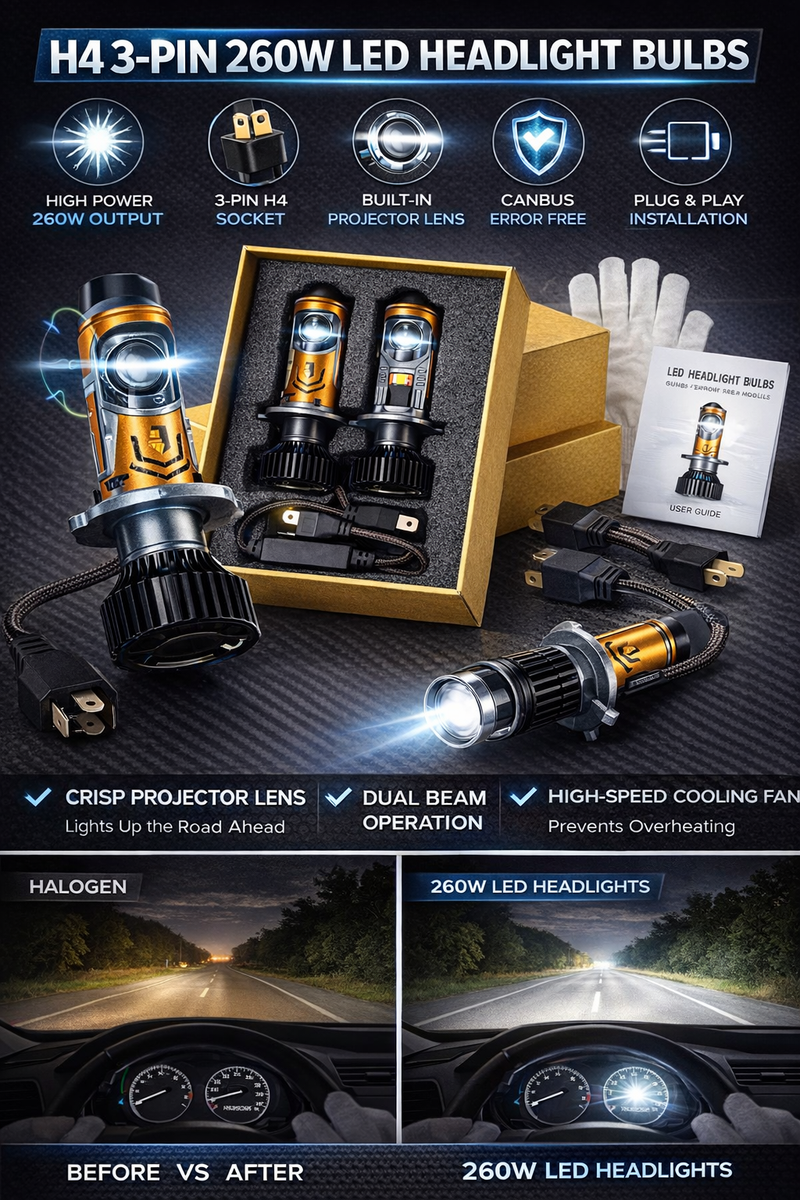 Upgrade your vehicle’s lighting performance with the H4 3-Pin 260W LED Headlight Bulb with Integrated Projector Lens. Designed for superior brightness, focused beam output, and enhanced road visibility, this advanced LED headlight solution provides a powerful upgrade over standard halogen bulbs.