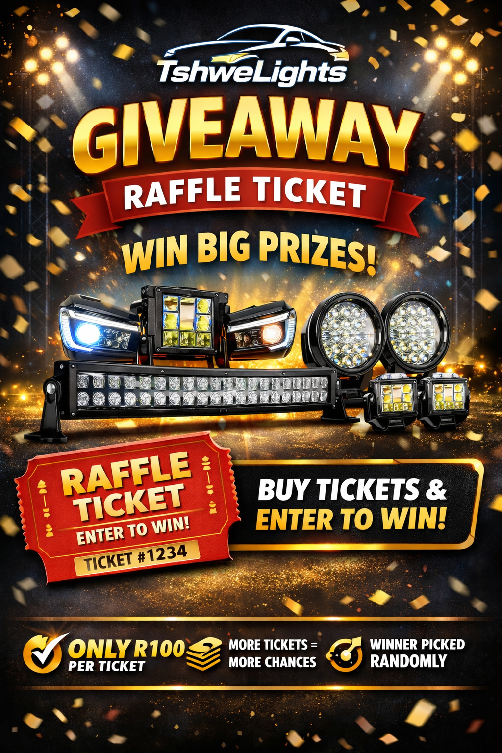 Stand a chance to win exclusive prizes from TshweLights by purchasing a giveaway raffle ticket. Each raffle ticket purchased counts as one entry into the draw. The winner will be selected fairly and randomly using a digital system on the announced draw date.